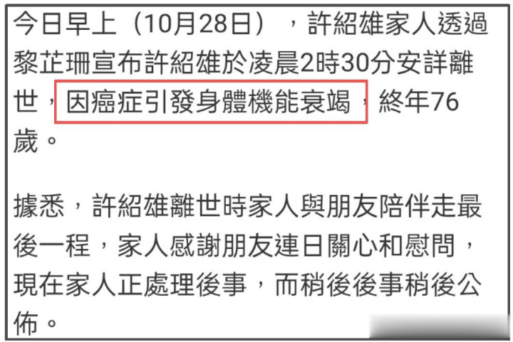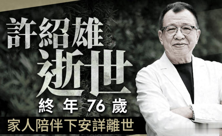据悉,许绍雄在凌晨2点30分安详离世,因癌症引发身体机能衰竭,享年76岁。在离世最后,家人和朋友陪伴他走过这一程,家人感谢亲朋好友连日的宽慰,正在忙着处理后事,稍后家人也会对外公布消息。